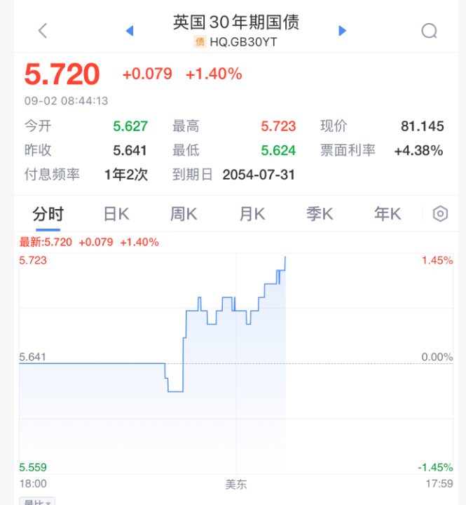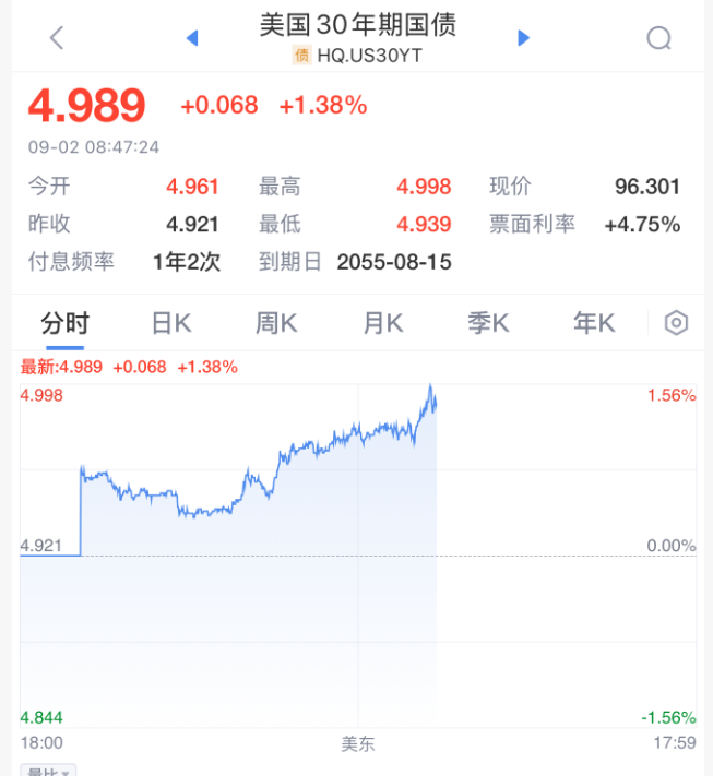 除了股市,债券市场也遭到抛售,30年期美债收益率上升6个基点至4.99%,而英国国债收益率触及自1998年以来的最高水平。