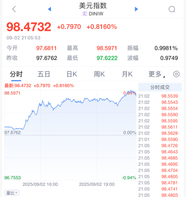 美元指数一度上涨0.8%,创下自7月30日以来的最大盘中涨幅。