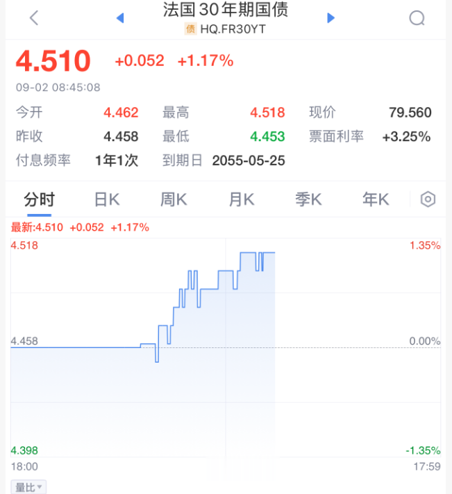 法国30年期国债收益率上涨5个基点,至4.50%以上,为2011年以来首次。