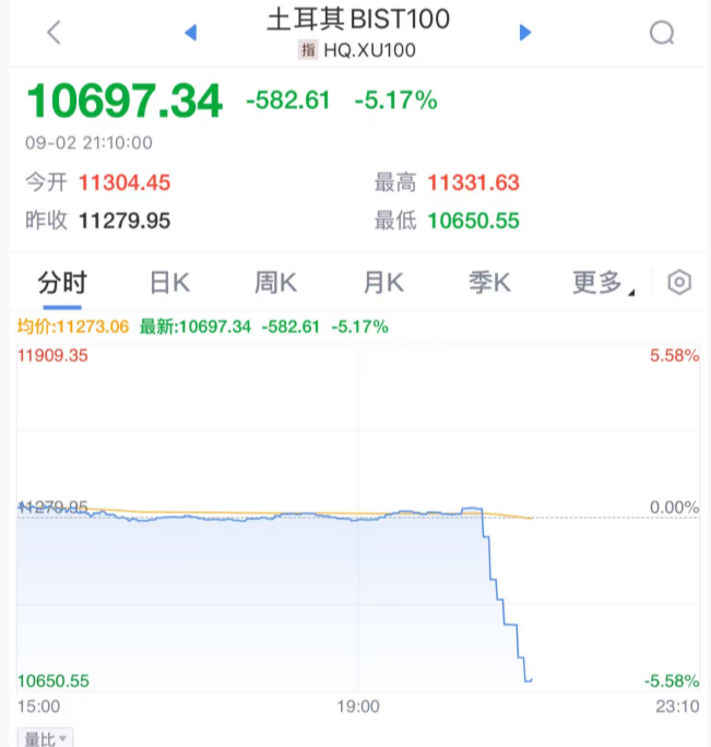 土耳其股市暴跌5%。此前土耳其法院解除主要反对党伊斯坦布尔领导人职务。