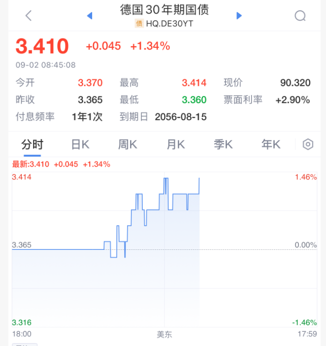 德国30年期国债收益率也上涨4个基点,至3.40%。德国政府计划发行两年期债券。
